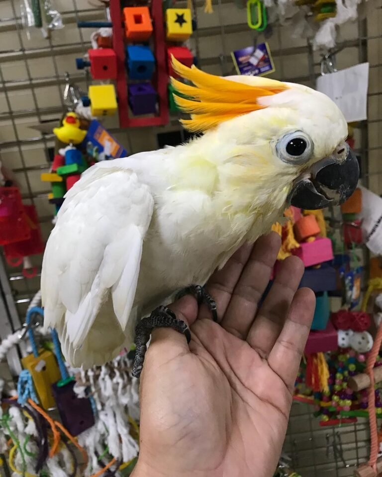 Citron-crested cockatoo is a medium-sized cockatoo with an orange crest, dark grey beak & pale orange ear patches. The underside of the larger wing and tail feathers have a pale yellow color. Citron’s have a lot of character and make great pets.