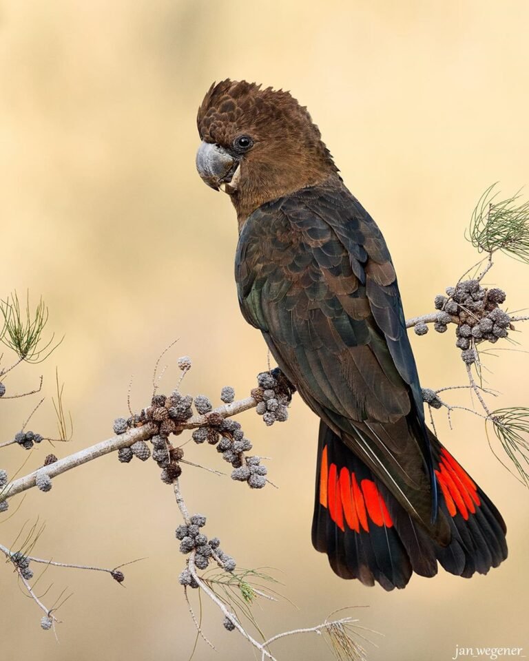 Glossy Black-Cockatoos mostly occur in eastern Australia, from south-eastern Queensland to eastern Victoria, and there is also an outlying population much further west, on Kangaroo Island in South Australia. One of the colloquial names for the species is the Casuarina Cockatoo, and this arises from the birds’ preferred food: the seeds of the casuarina tree. They strip the seed pods from the tree, then tear them open with their strong bills to extract the seeds — the ground below is often littered with dozens of discarded cones.